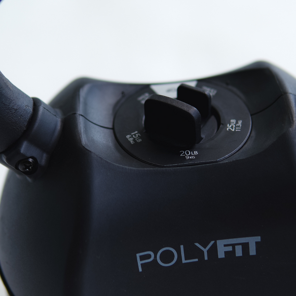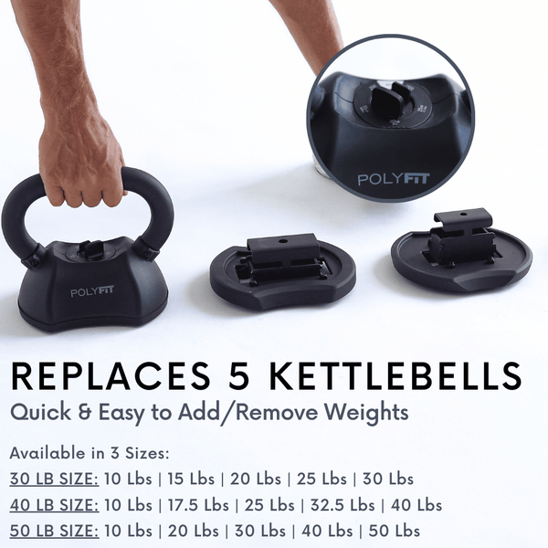 AVAILABLE IN 3 SIZES | ADJUSTABLE KETTLEBELL. With weight options ranging from 10-30lbs for the 30lb kettlebell,10-40lbs for the 40lb kettlebell, and 10-50lbs for the 50lb kettlebell, the Polyfit Adjustable Kettlebells serve as the perfect all-in-one fitness solution for various workout routines and skill levels.