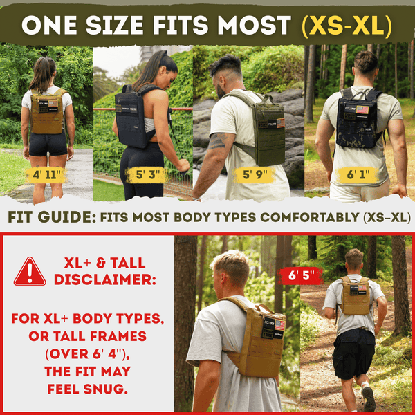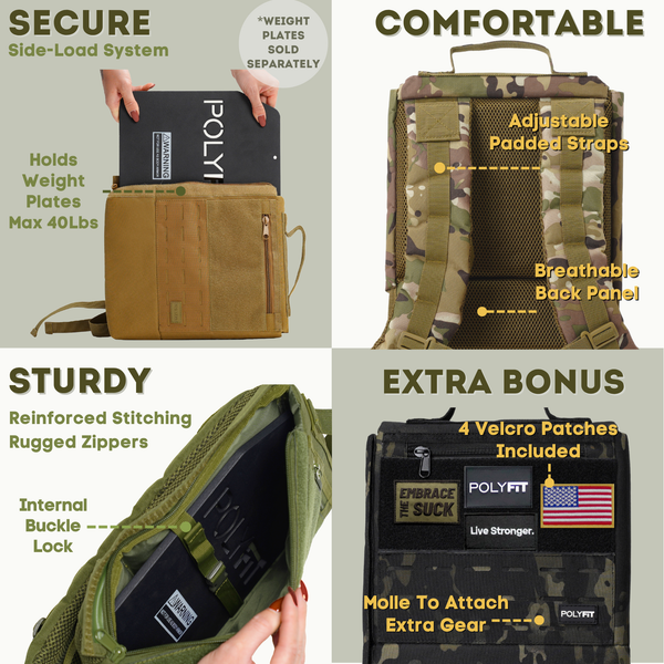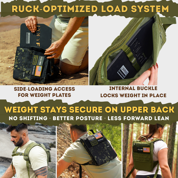 【RUCK-OPTIMIZED LOAD SYSTEM】Our patent-pending side-loading design makes it easy to insert or remove weight plates while keeping them locked in place with an internal buckle system—no shifting, even during intense movement. Holds up to 40 lbs and fits Polyfit Weight Plates, cast iron plates, and similar styles up to 10 x 12 inches (plates sold separately).
